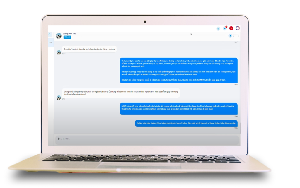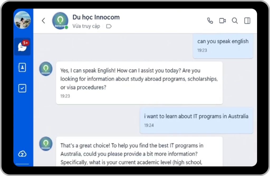 Tính năng này đặc biệt hữu ích trong ngành tư vấn du học, nơi khách hàng và phụ huynh có thể sinh sống ở nhiều quốc gia hoặc quen sử dụng các ngôn ngữ khác nhau. Chatbot không chỉ dịch nghĩa, mà còn điều chỉnh cách diễn đạt phù hợp với văn hóa và bối cảnh, giúp thông tin về chương trình học, học bổng và quy trình thủ tục được truyền tải chính xác, dễ hiểu.