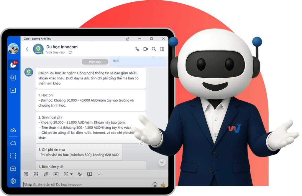 AI Chatbot của Innocom được thiết kế với khả năng tư vấn thông minh, giúp tối ưu hóa quy trình chăm sóc khách hàng. Chatbot không chỉ đơn thuần trả lời câu hỏi theo kịch bản sẵn có, mà còn sử dụng công nghệ xử lý ngôn ngữ tự nhiên (NLP) để hiểu đúng ý định và ngữ cảnh của người hỏi. Nhờ kết nối trực tiếp với kho dữ liệu tập trung, bao gồm thông tin mới nhất về học bổng, chương trình học, điều kiện tuyển sinh, quy trình làm hồ sơ và các thủ tục liên quan, chatbot có thể cung cấp câu trả lời nhanh chóng, chính xác và nhất quán cho từng tình huống.
