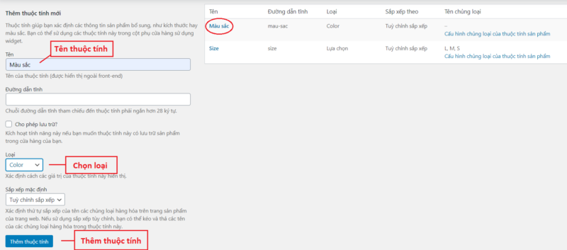 Nhập tên -> Chọn loại thuộc tính -> Thêm thuộc tính