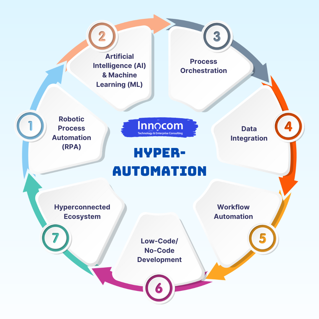 Hyperautomation sử dụng trí tuệ nhân tạo, tự động hóa quy trình robot, và các công nghệ tiên tiến khác để tối ưu hóa quy trình kinh doanh như thế nào? Lợi ích và cách triển khai Hyperautomation thế nào cho hiệu quả? Hãy cùng INNOCOM khám phá khái niệm này nhé!