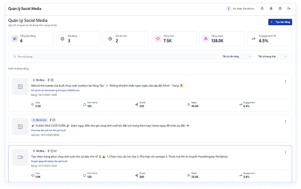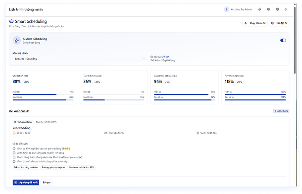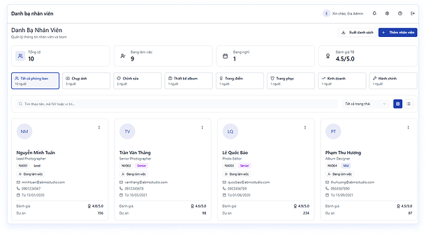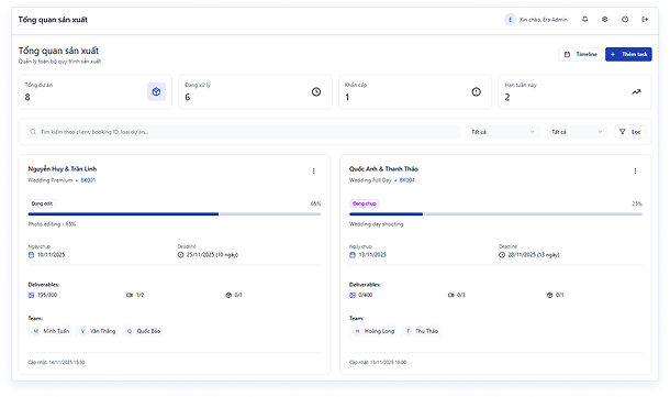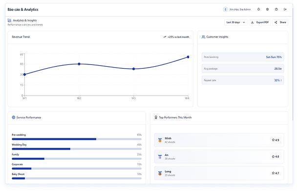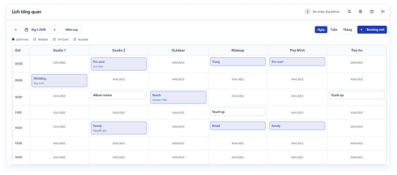 Hệ thống quản lý toàn diện cho studio chụp ảnh cưới, từ booking đến sản xuất và tài chính.