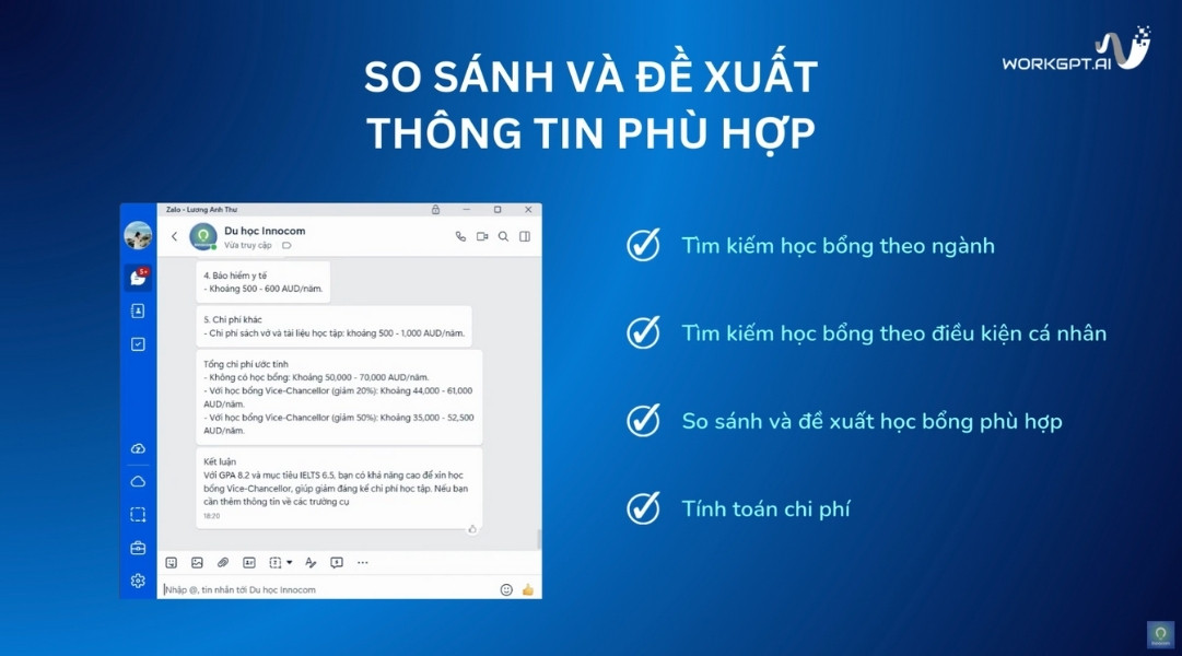 Không chỉ tư vấn theo yêu cầu trực tiếp, WorkGPT Zalobot còn có khả năng xử lý thông tin phức tạp để đưa ra gợi ý phù hợp nhất. Trong ngành giáo dục – du học, khi khách hàng cần tìm học bổng theo ngành hoặc theo điều kiện cá nhân như GPA, chứng chỉ tiếng Anh hoặc khả năng tài chính, WorkGPT Zalobot có thể phân tích toàn bộ dữ liệu mà doanh nghiệp cung cấp để đưa ra danh sách học bổng phù hợp. WorkGPT Zalobot có thể tổng hợp học phí, chi phí sinh hoạt, phí hồ sơ và đưa ra tổng chi phí ước tính ngay trong cuộc trò chuyện.