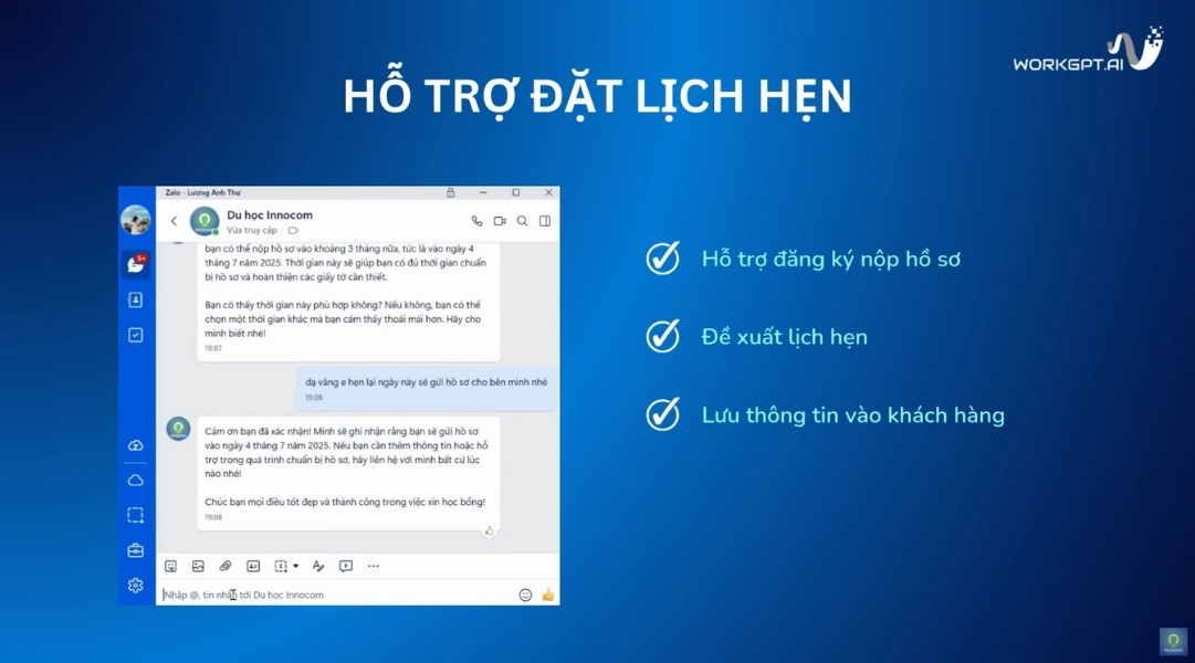 WorkGPT Zalobot còn đảm nhận vai trò thư ký ảo khi có thể hỗ trợ khách đặt lịch tư vấn, lịch nộp hồ sơ hoặc lịch gặp trực tiếp. Khi khách hàng thể hiện nhu cầu, chatbot ai sẽ đưa ra các khung giờ còn trống dựa trên lịch làm việc mà doanh nghiệp thiết lập. Nếu khách đồng ý, thông tin sẽ được ghi nhận và lưu trữ tự động. Quá trình đặt lịch diễn ra mượt mà, không cần nhân viên can thiệp và giảm nguy cơ quên lịch hoặc đặt trùng giờ.